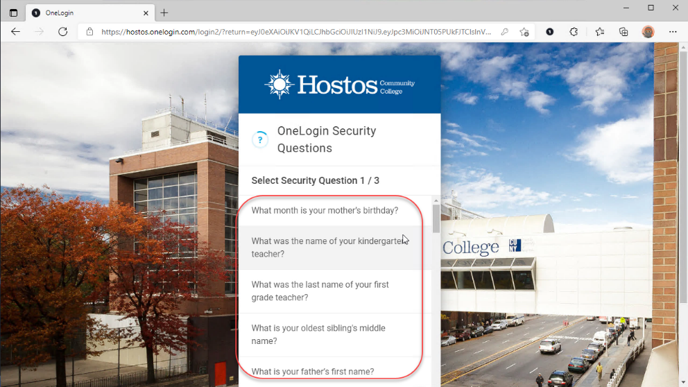 Please Note: if you have only set up security questions, you will not have the option to use an Authenticator app or the OneLogin Protect app for this step. If you have forgotten your security questions, lost access to the authenticator app, or you have not set up your account to use Hostos SSO, you will need to contact the Service Desk for assistance.