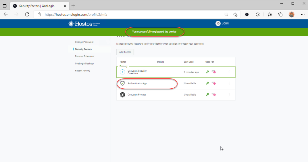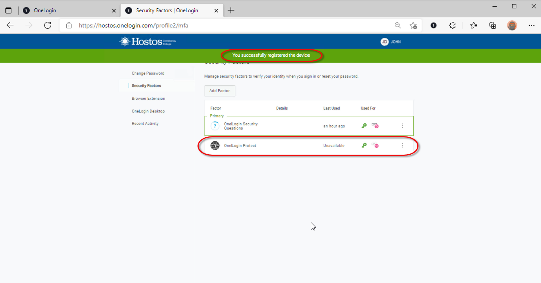 - A success message appears on top as shown. Also, OneLogin Protect appears in your list