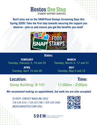The Supplemental Nutrition Assistance Program (SNAP) provides food support to qualifying New Yorkers including working families, the elderly and the disabled to increase their ability to purchase food. To receive SNAP benefits, a household must qualify under eligibility rules set by the federal government. Students meet with the Single Stop counselor in the comfort of the office to complete the electronic application for SNAP. The process is short and confidential.