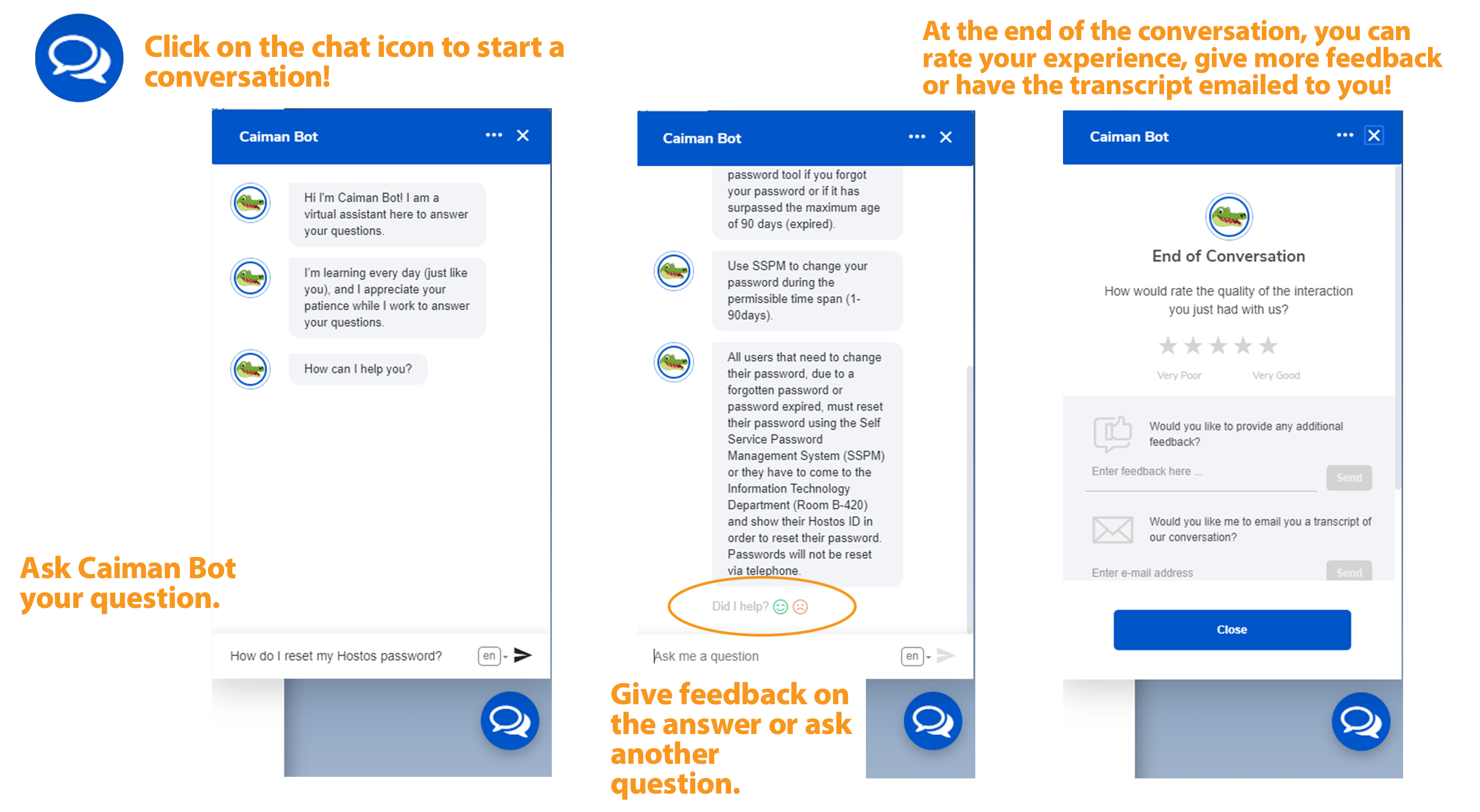 - At the end of the conversation, you can rate your experience, give more feedback or have the transcript emailed to you