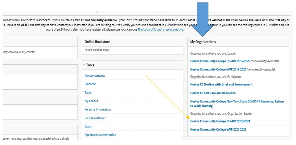 - To login to the CUNY Blackboard, click on the following link: http://www.cuny.edu/ then on the top right hand side click “Login” and select “Blackboard”. After using your CUNYfirst credentials to login, go to the right side of the Blackboard home page and you will see “My Organizations”. Click on “Hostos Community College ESPARC 2020-2021” to start the training. It may take a few minutes for the “My Organizations” module to load.