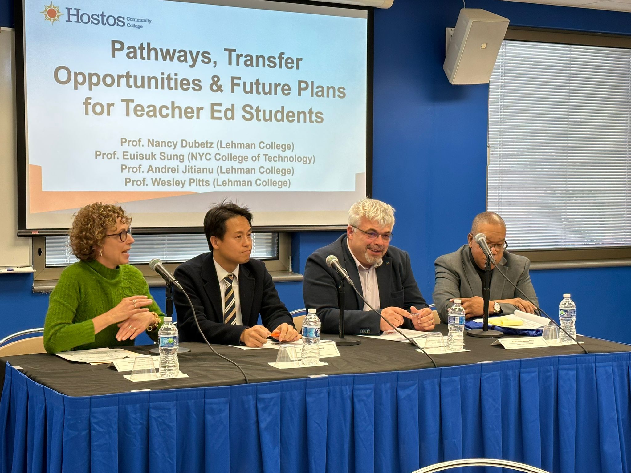 Next, there was an insightful discussion on pathways, transfer opportunities and future plans for teacher education students, featuring faculty from Hostos’ sister colleges: Dr. Nancy Dubetz, Professor of Early Childhood and Childhood Education, Lehman College; Dr. Euisuk Sung, Assistant Professor and Chair of Career and Technology Teacher Education, New York City College of Technology; Dr. Andrei Jitianu, Professor and Chair of the Department of Chemistry, Lehman College; and Dr. Wesley Pitts, Professor of Science Education in the Department of Middle and High School Education, Lehman College.